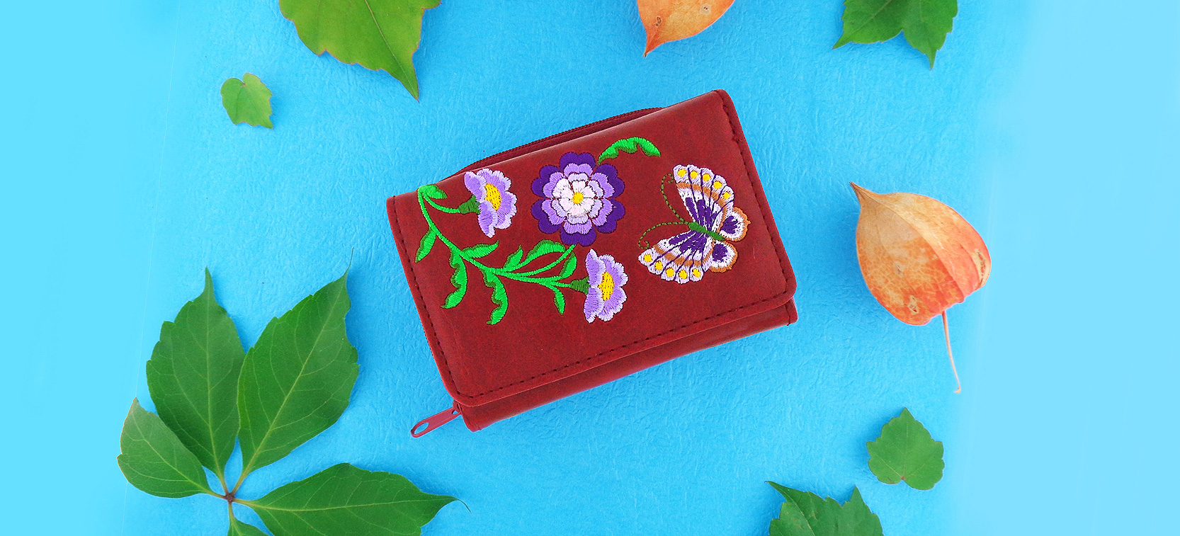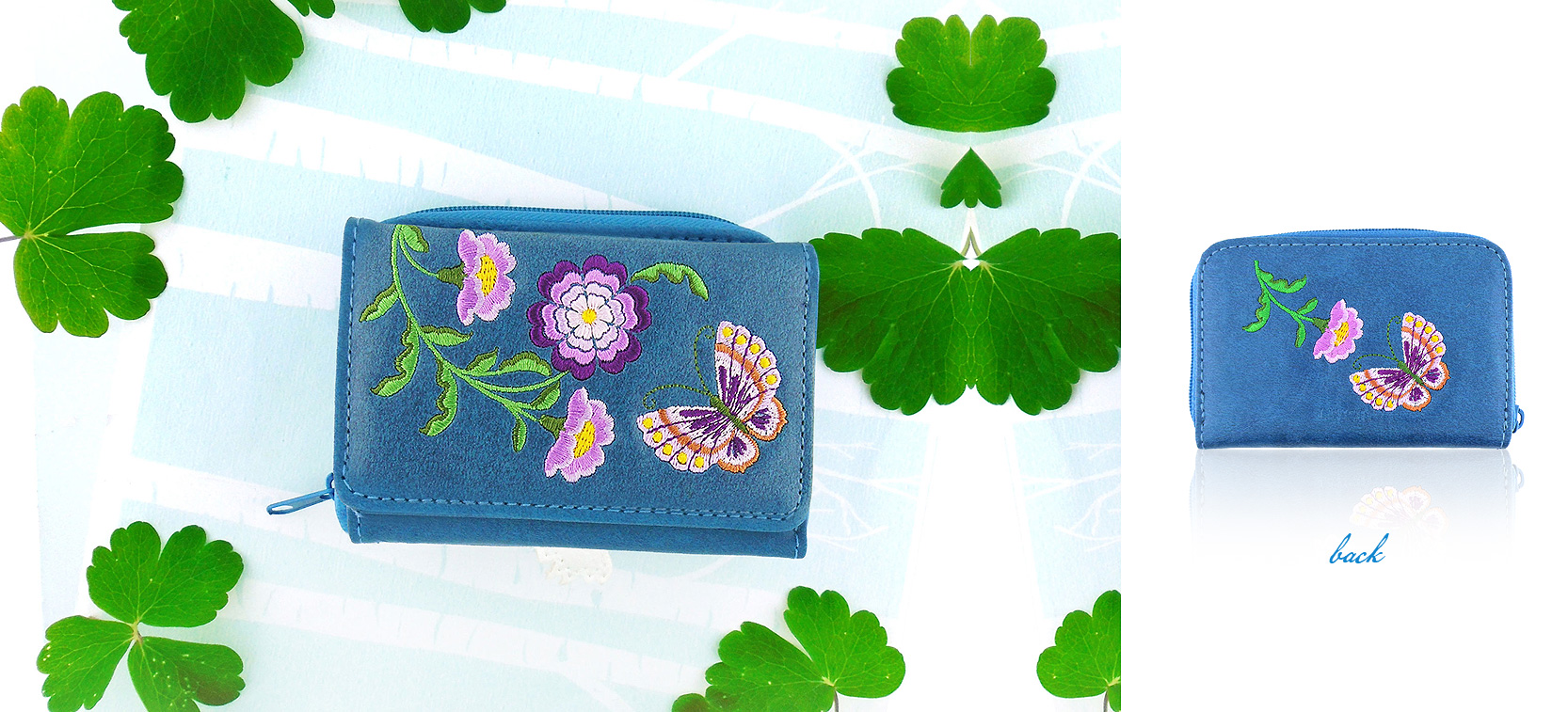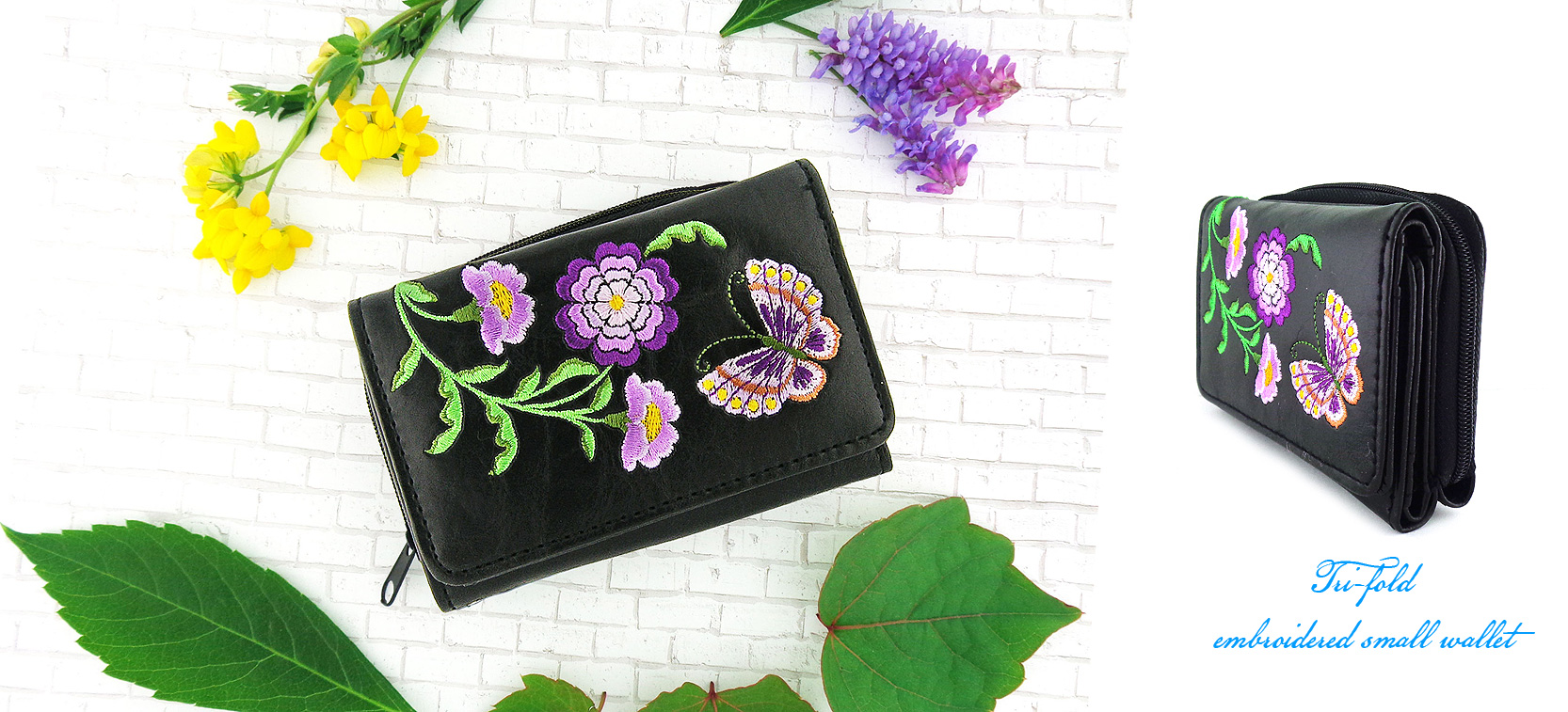 LAVISHY design and wholesale original, beautiful and affordable Eco-friendly embroidered small tri-fold wallets made with cruelty-free vegan materials for Elma collection--our international best selling collections since 2002. It's original, beautiful and fun for everyday use, also makes a great gift idea for family and friends.
