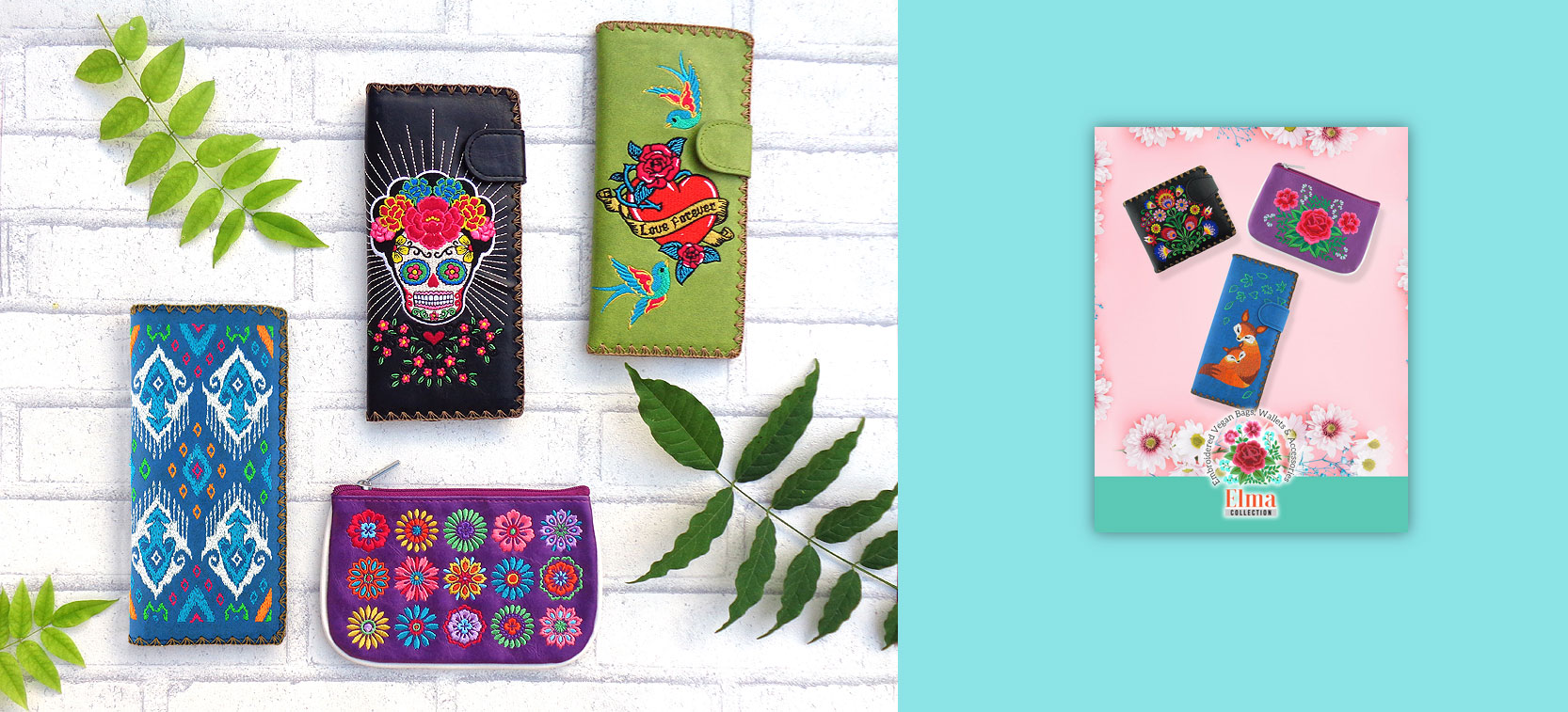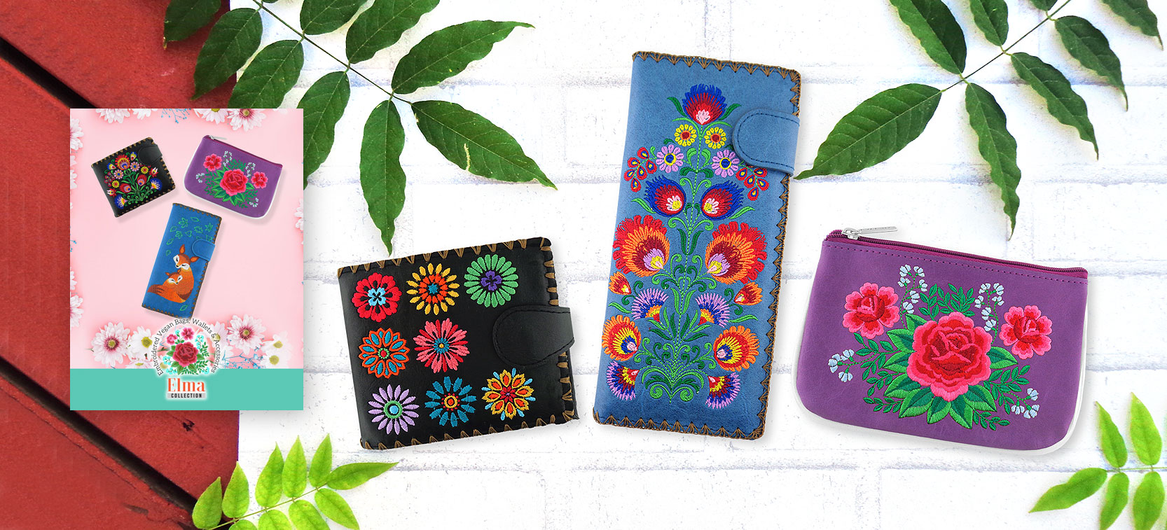 Elma collection has bags, clutches, large wristlet wallets, large flat wallets, medium wallets, small wallets, kiss lock frame coin purses, small pouches, card holders, makeup pouches, jewelry pouches, e-reader sleeves, passport wallets, passport covers and luggage tags. Elma collection embroidered vegan bags, wallets, wristlets, makeup pouches, luggage tags, passport wallets, passport covers, coin purses and e-reader sleeves are great for gift shops, clothing and fashion accessories boutiques, book stores, museum and botanical garden gift shops, hotel/resort/airport/ferry gift stores, flower shops and garden centers, hair salons and spas, and specialty retailers.